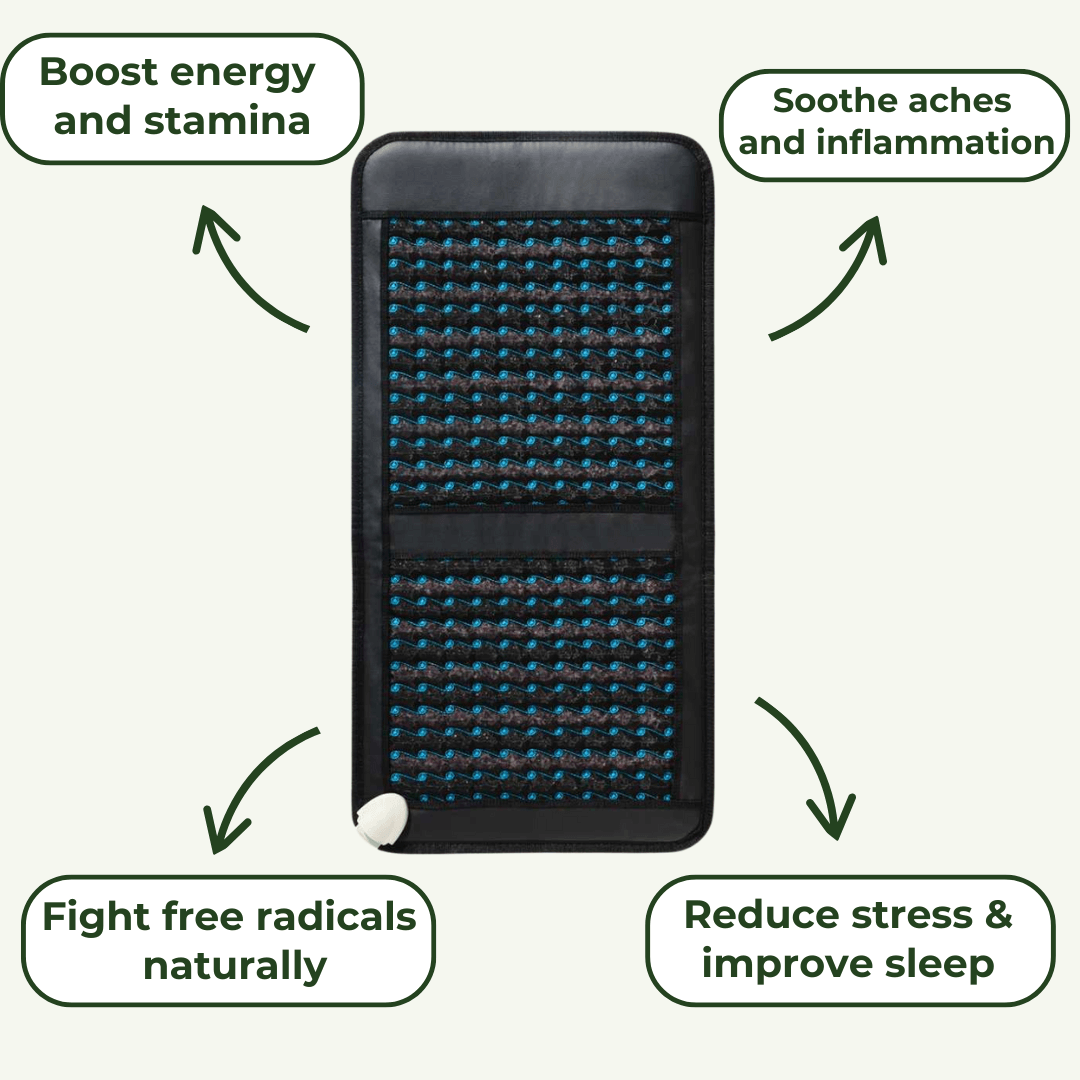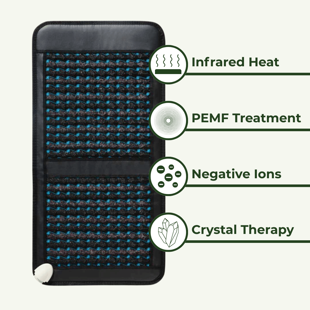 The mat combines PEMF therapy, far infrared heat, negative ion therapy, and crystal therapy to support full-body wellness.